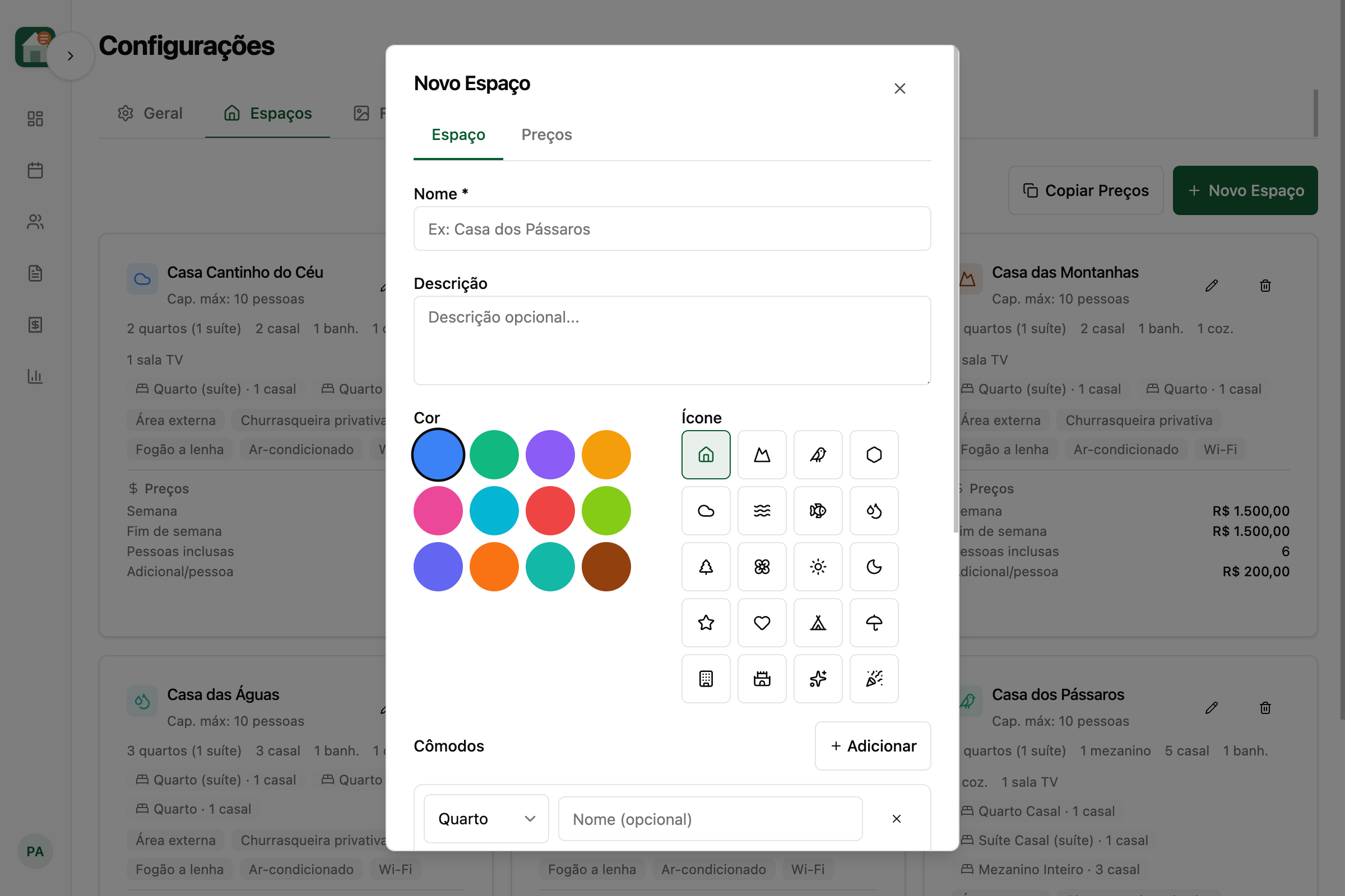 Adicione seus quartos, cabanas ou áreas do sítio. Defina capacidade, preço e disponibilidade de cada espaço.